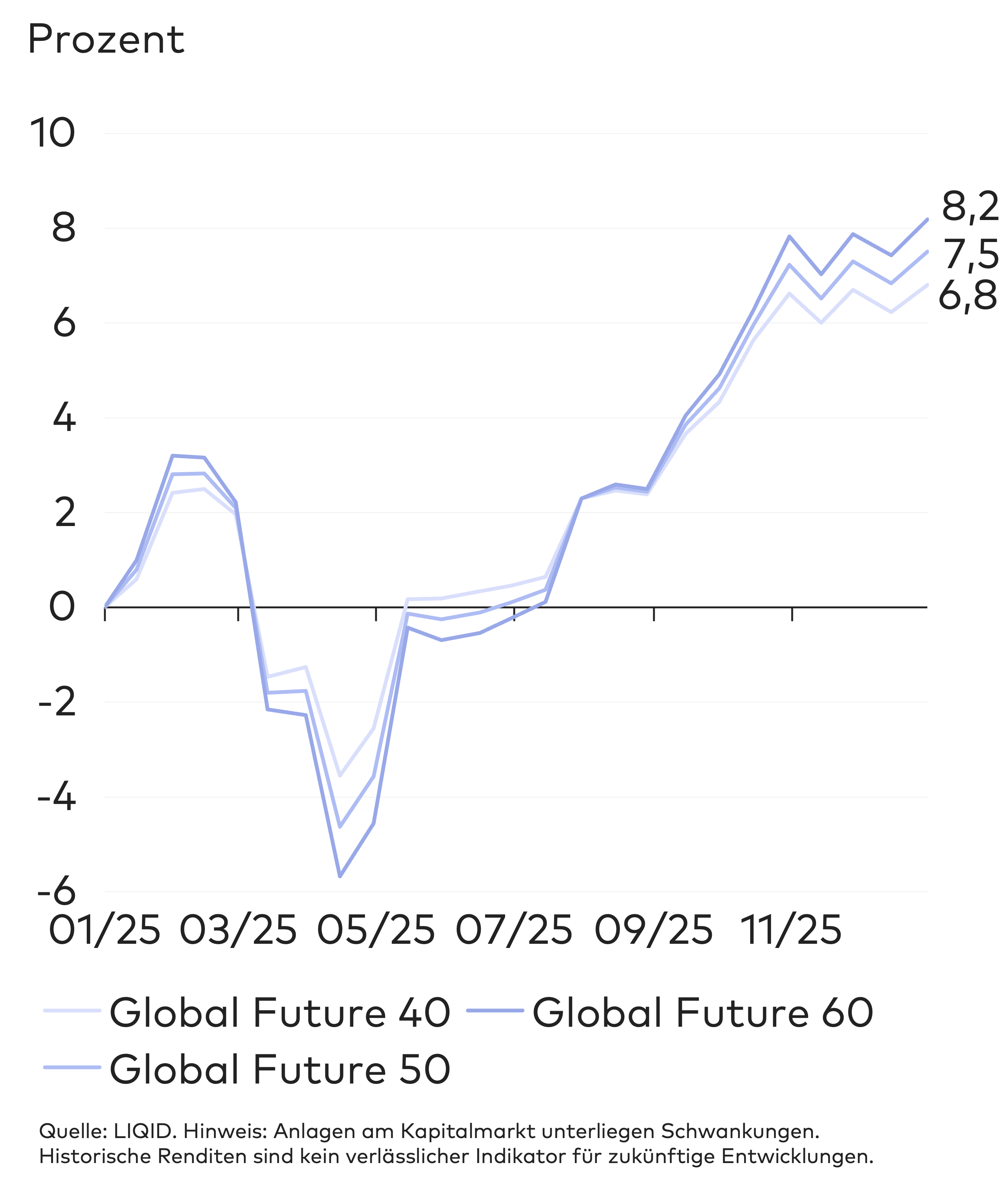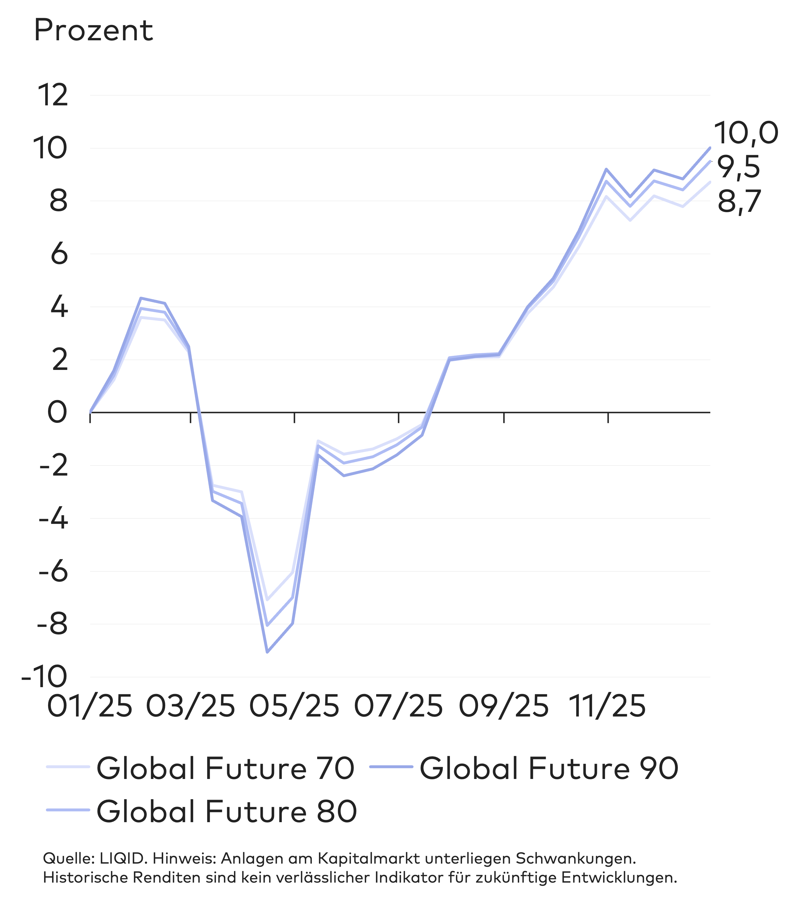 Das vierte Quartal 2025 brachte mehr Stabilität an die Kapitalmärkte. Die abflauende Inflation, die US-Zinssenkungen und eine beginnende Konjunkturerholung führten zu einer vorsichtigen, aber nachhaltigen Stimmungsaufhellung zum Jahresende. Während Aktien und Unternehmensanleihen zulegen konnten, blieb Gold ein wichtiger Stabilisator und Renditetreiber im Portfolio. Anleger blicken damit auf ein Jahr zurück, das nach Phasen hoher Volatilität mit einer konstruktiveren Perspektive in das Jahr 2026 überleitet.
