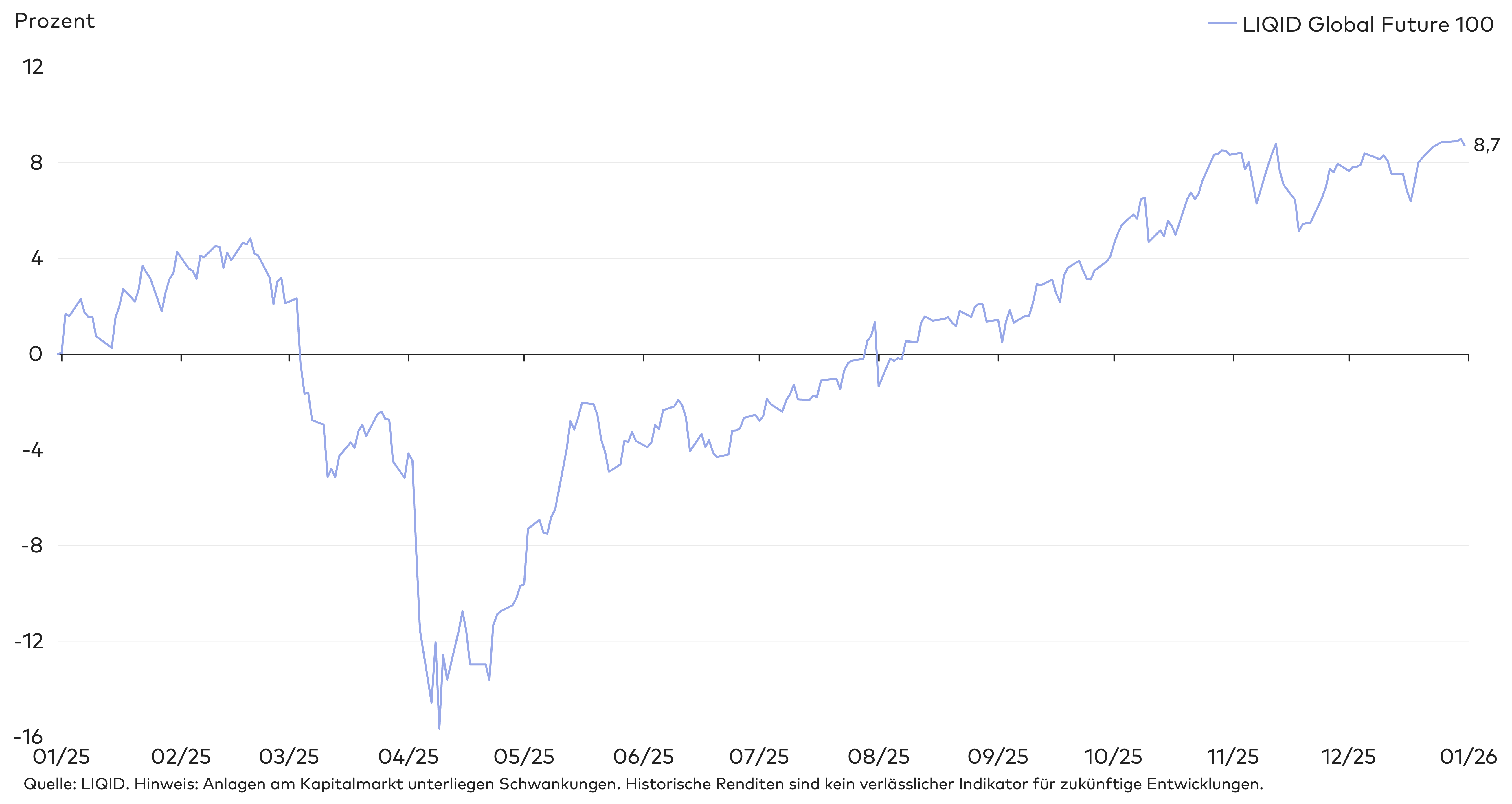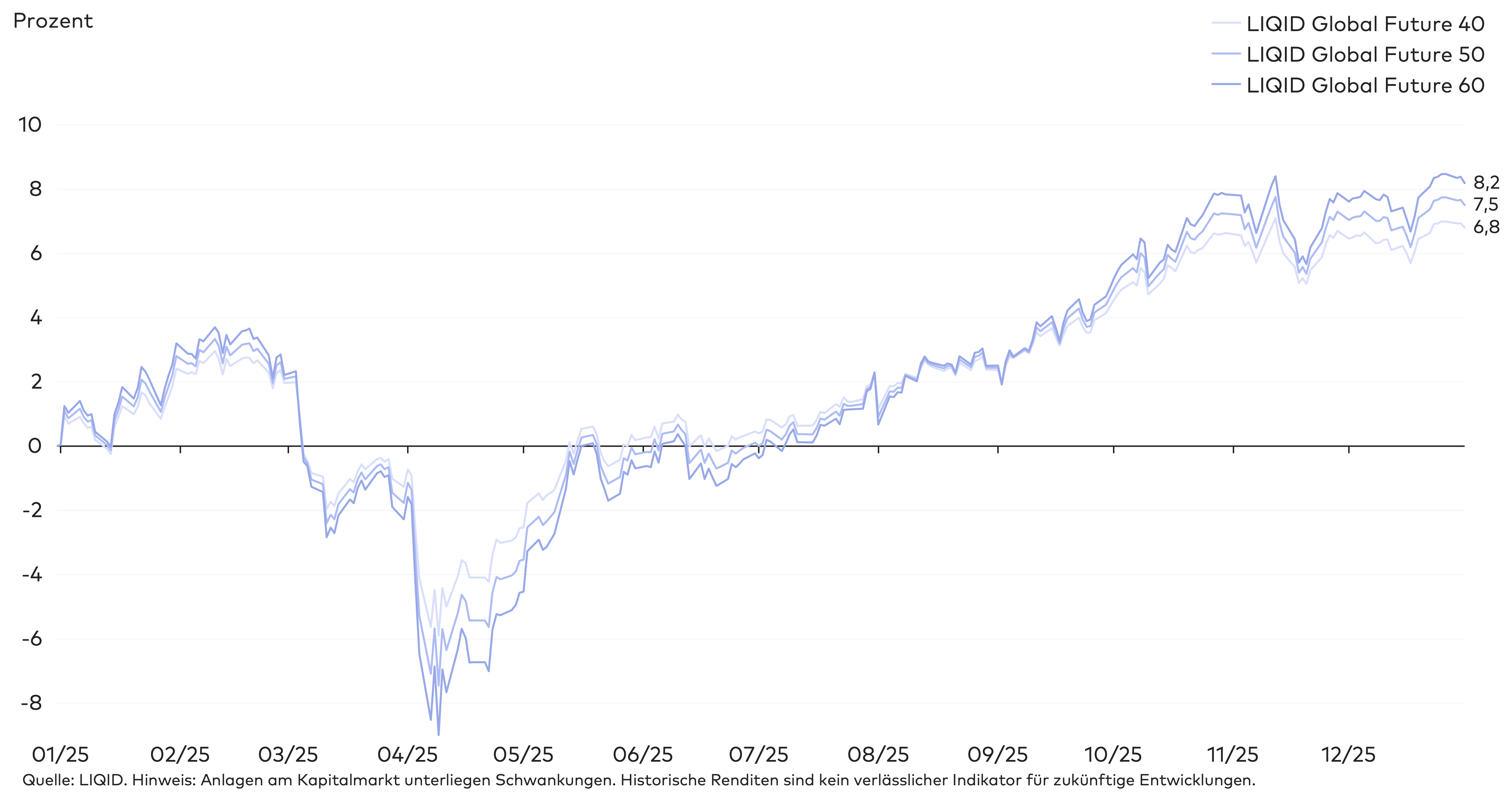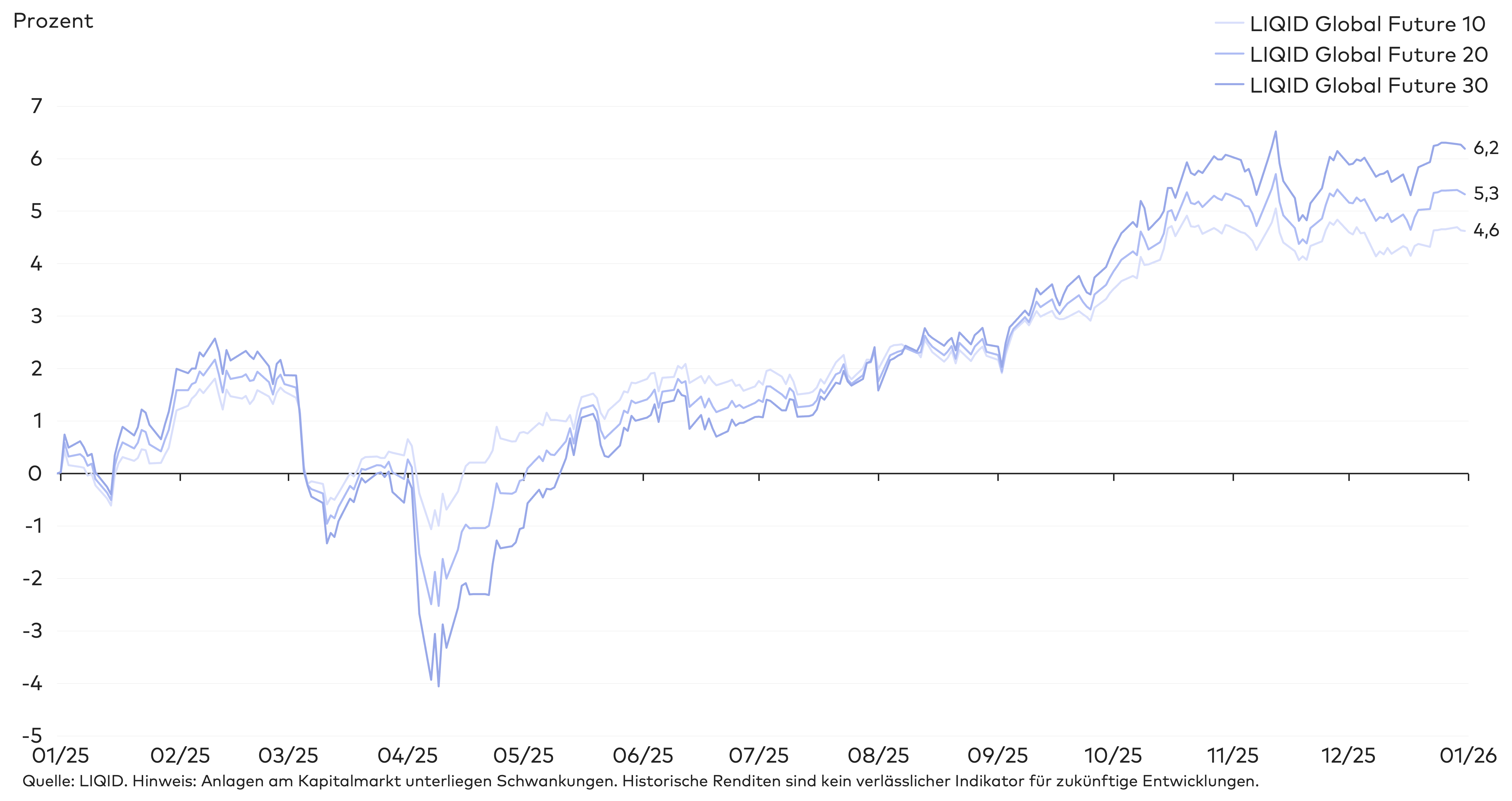 Die Entwicklung der einzelnen Anlageklassen spiegelte sich größtenteils auch in der Performance der von LIQID eingesetzten Instrumente wider. Innerhalb der Aktienallokation verzeichnete der UBS S&P 500 ESG Elite ETF mit einem Wertzuwachs von 7,6 Prozent im vierten Quartal den stärksten Anstieg. Die übrigen Aktien-ETFs schlossen mit Zuwächsen zwischen 0,2 und 6,8 Prozent ab.