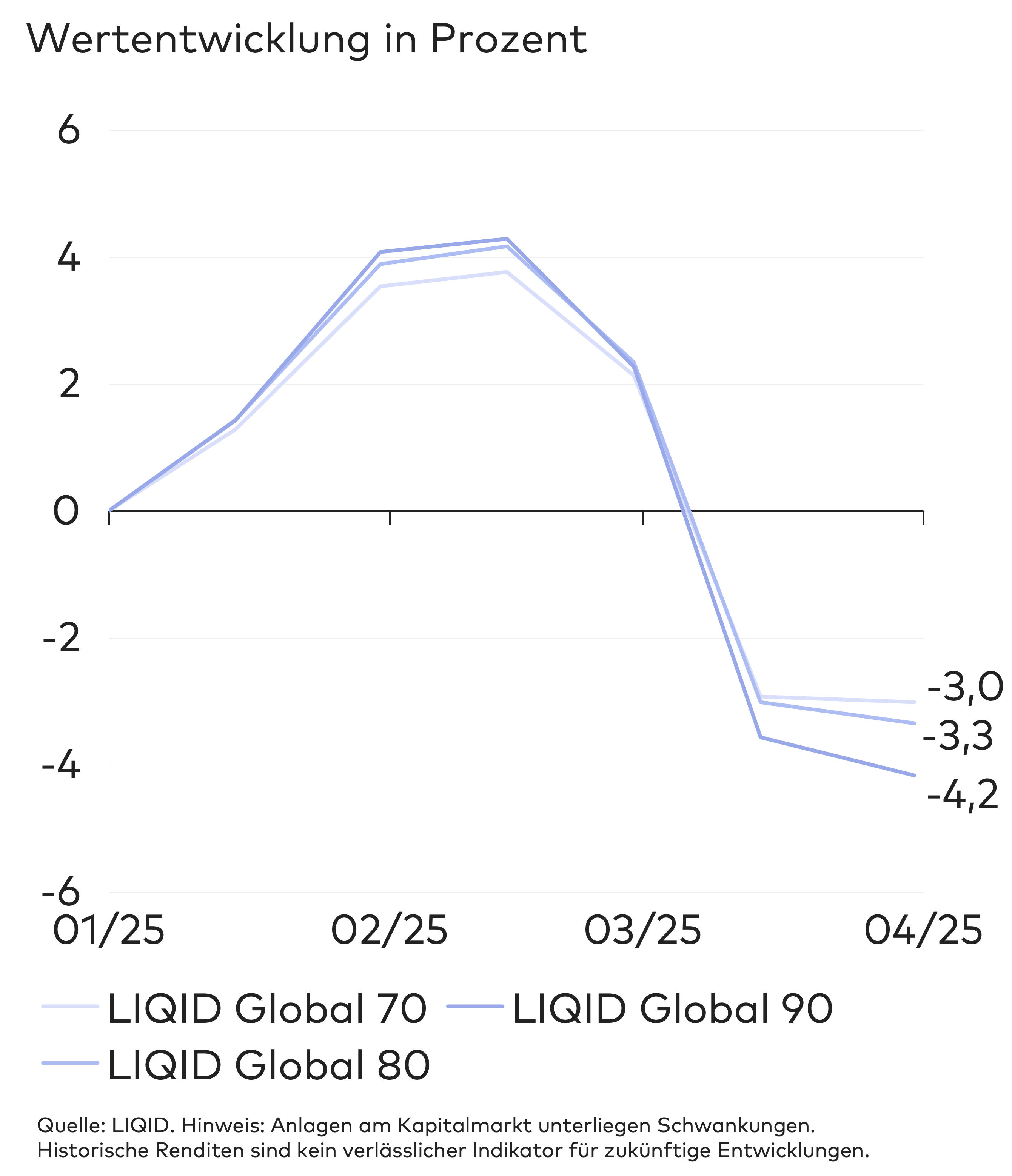 Die Entwicklung der einzelnen Anlageklassen spiegelt sich in der Performance der von LIQID eingesetzten Instrumente wider. Innerhalb der Aktienallokation verzeichnete der iShares Core MSCI Europe mit einem Wertzuwachs von 6,5 Prozent im ersten Quartal den mit Abstand stärksten Anstieg. Die übrigen Aktien-ETFs schlossen hingegen allesamt mit Verlusten ab. Besonders US-Aktien gaben nach der starken Rally der vergangenen zwei Jahre deutlich nach und verloren 8,5 Prozent. Im Bereich festverzinslicher Wertpapiere überzeugte insbesondere der Amundi Global Government Inflation-Linked Bond ETF mit einer Rendite von knapp 2,2 Prozent. Insgesamt erzielten alle Anleihen-ETFs eine positive Entwicklung – mit Ausnahme der Position in Schwellenländeranleihen, die Verluste hinnehmen musste. Auch die alternativen Anlageklassen entwickelten sich weiterhin sehr positiv: Xetra-Gold legte um beeindruckende 15,2 Prozent zu, während der iShares Commodity ETF einen Wertzuwachs von 4,3 Prozent verzeichnete.
