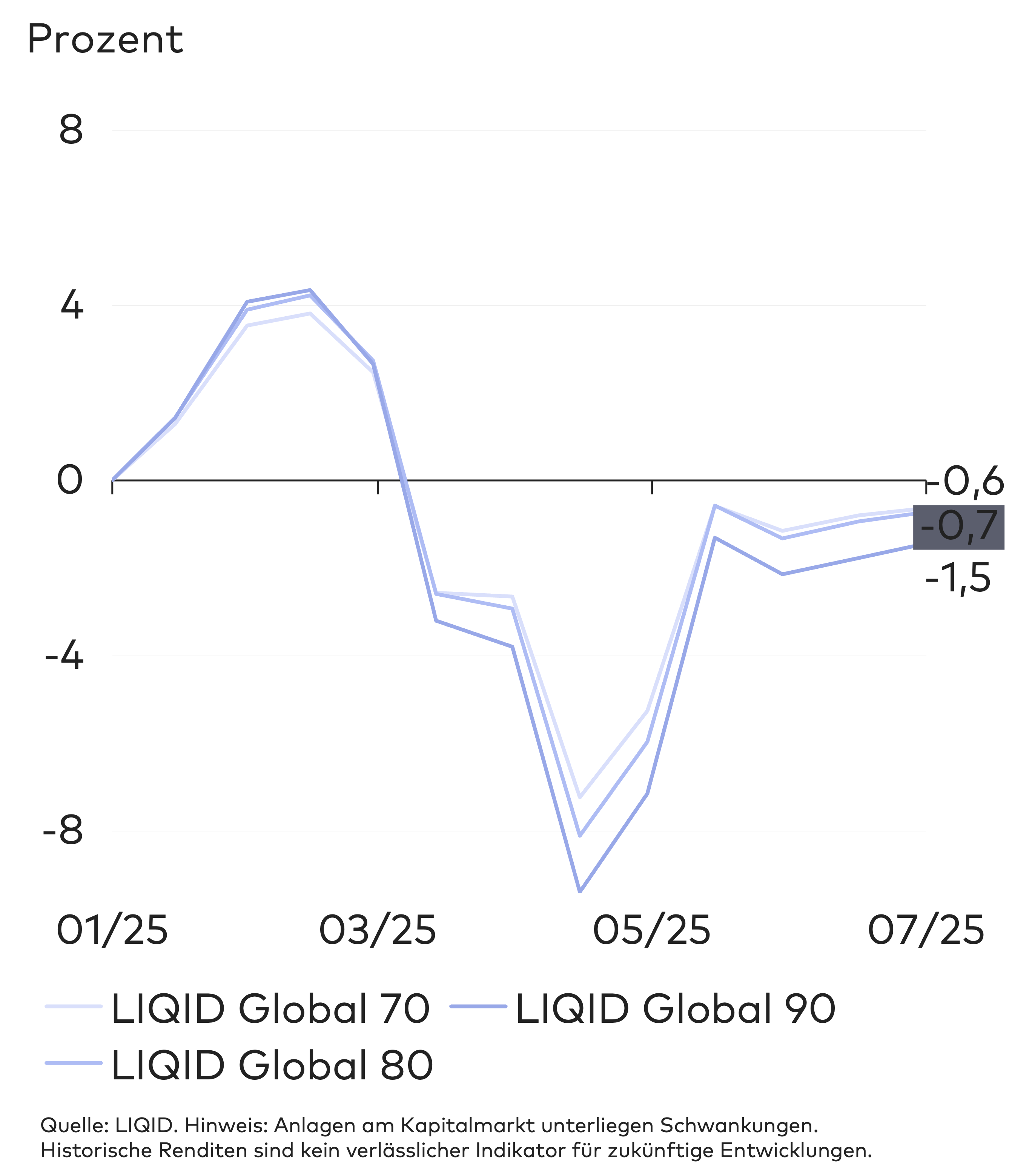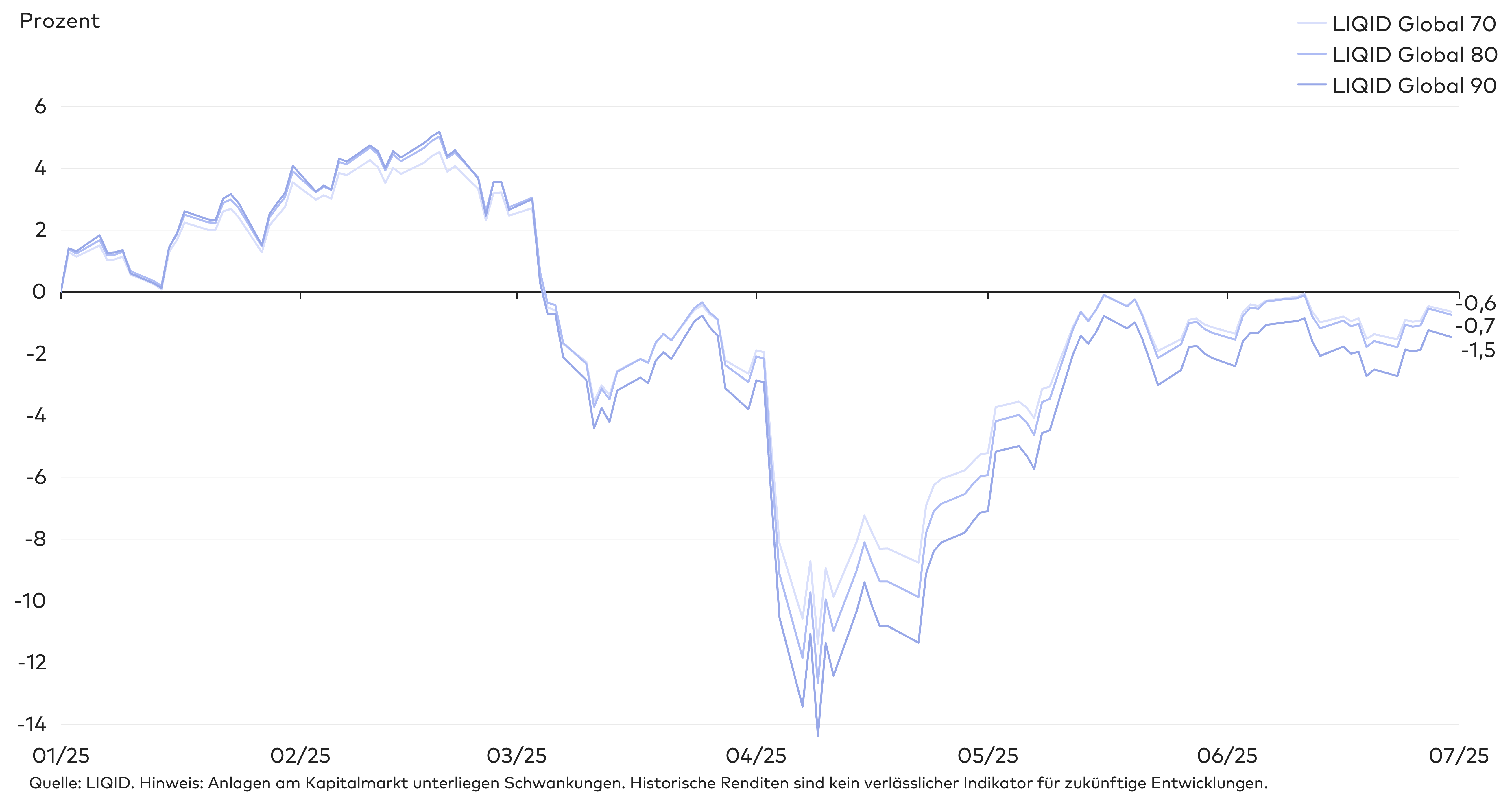 Im zweiten Quartal fielen die Ergebnisse der LIQID Global Strategien gemischt aus. Je nach Aktienanteil lag die kumulierte Wertentwicklung seit Jahresbeginn zwischen 1,9 und -2,5 Prozent. Besonders der sogenannte „Liberation Day“ Anfang April löste eine Welle der Verunsicherung aus und führte zu deutlichen Kursrückgängen an den Finanzmärkten. Zusätzlich führte die Aufwertung des Euro gegenüber dem US-Dollar und Yen zu einer verminderten Rendite.