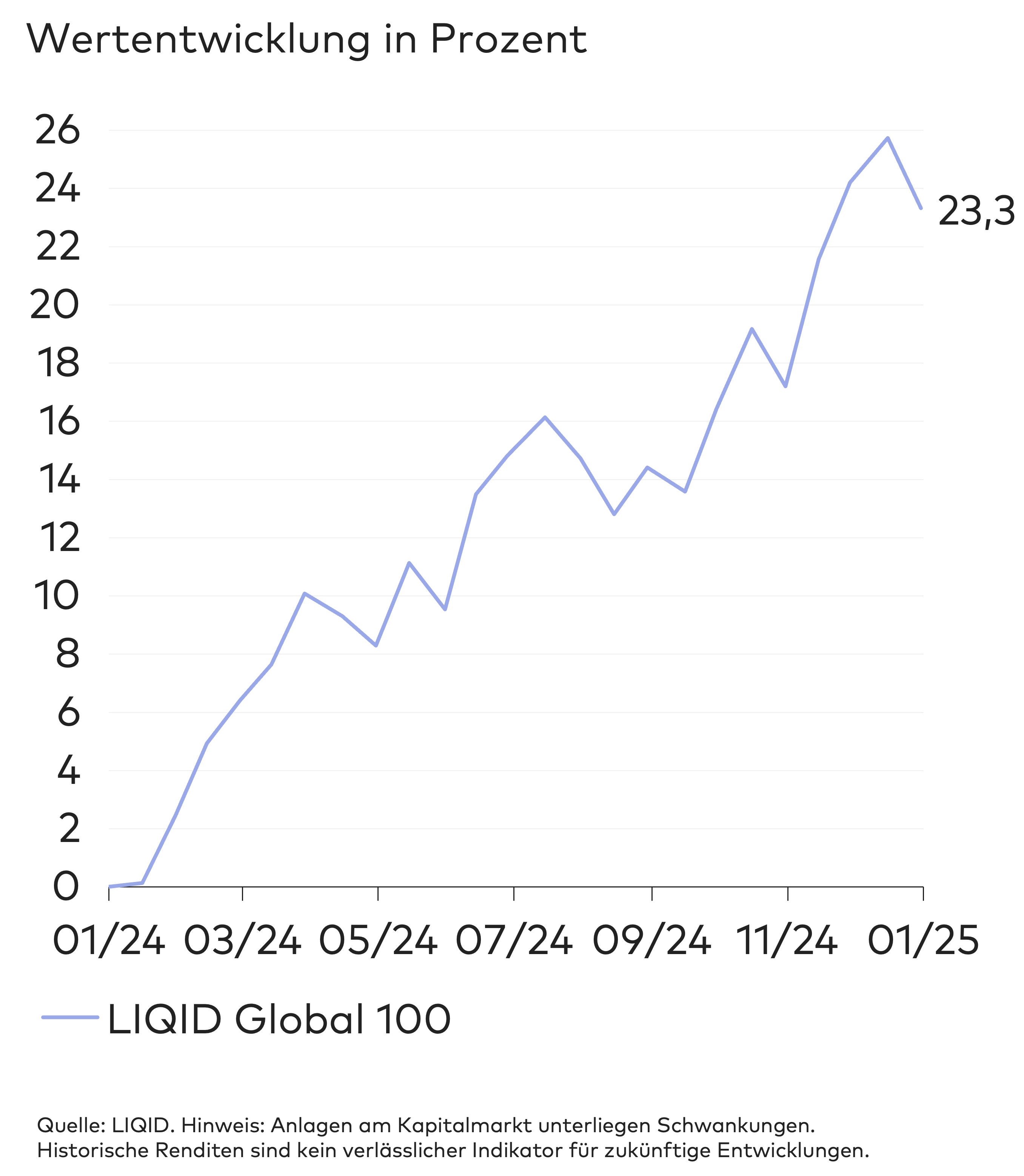 Im Jahresverlauf haben die LIQID Global Strategien nicht nur absolut, sondern auch relativ zu ihren Benchmarks sehr gut abgeschnitten. In fast allen Risikoklassen lag die kumulierte Rendite der LIQID Strategien über den jeweiligen Vergleichswerten. In sämtlichen Risikoklassen entwickelten sich die LIQID Strategien außerdem schwankungsärmer. Die risikoadjustierte Performance der LIQID Portfolios war vor allem in den konservativen und ausgewogenen Portfolios besser als die der Referenzportfolios.