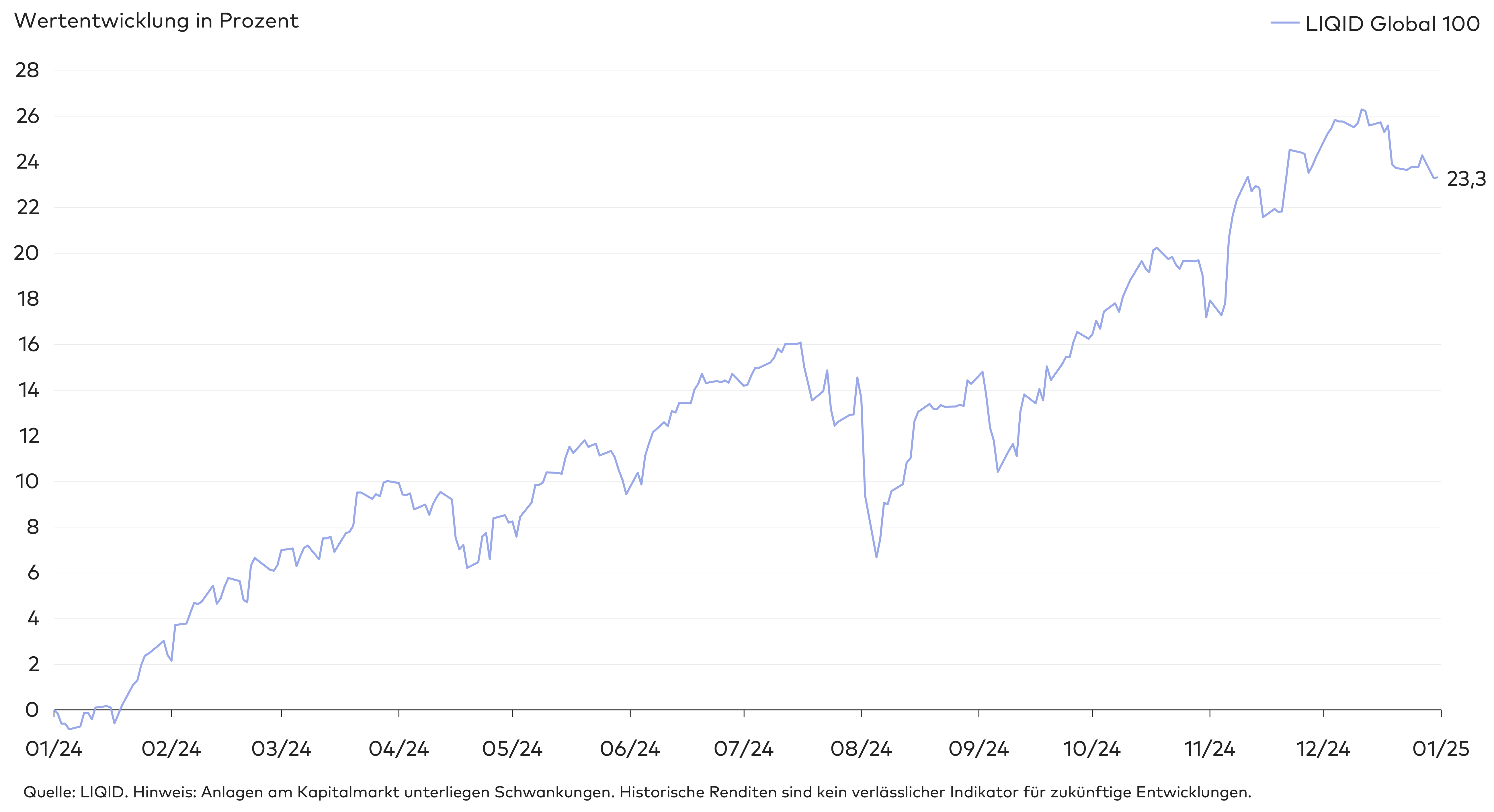 Im vierten Quartal erzielten alle LIQID Global Strategien positive Renditen. Der kumulierte Wertzuwachs lag je nach Aktienanteil der Strategie zwischen 0,2 und 5,7 Prozent. Nachdem im vorherigen Quartal Anleihen eine bessere Performance als Aktien gezeigt hatten, waren es in diesem Quartal erneut Aktien, die maßgeblich zur positiven Entwicklung beitrugen.
