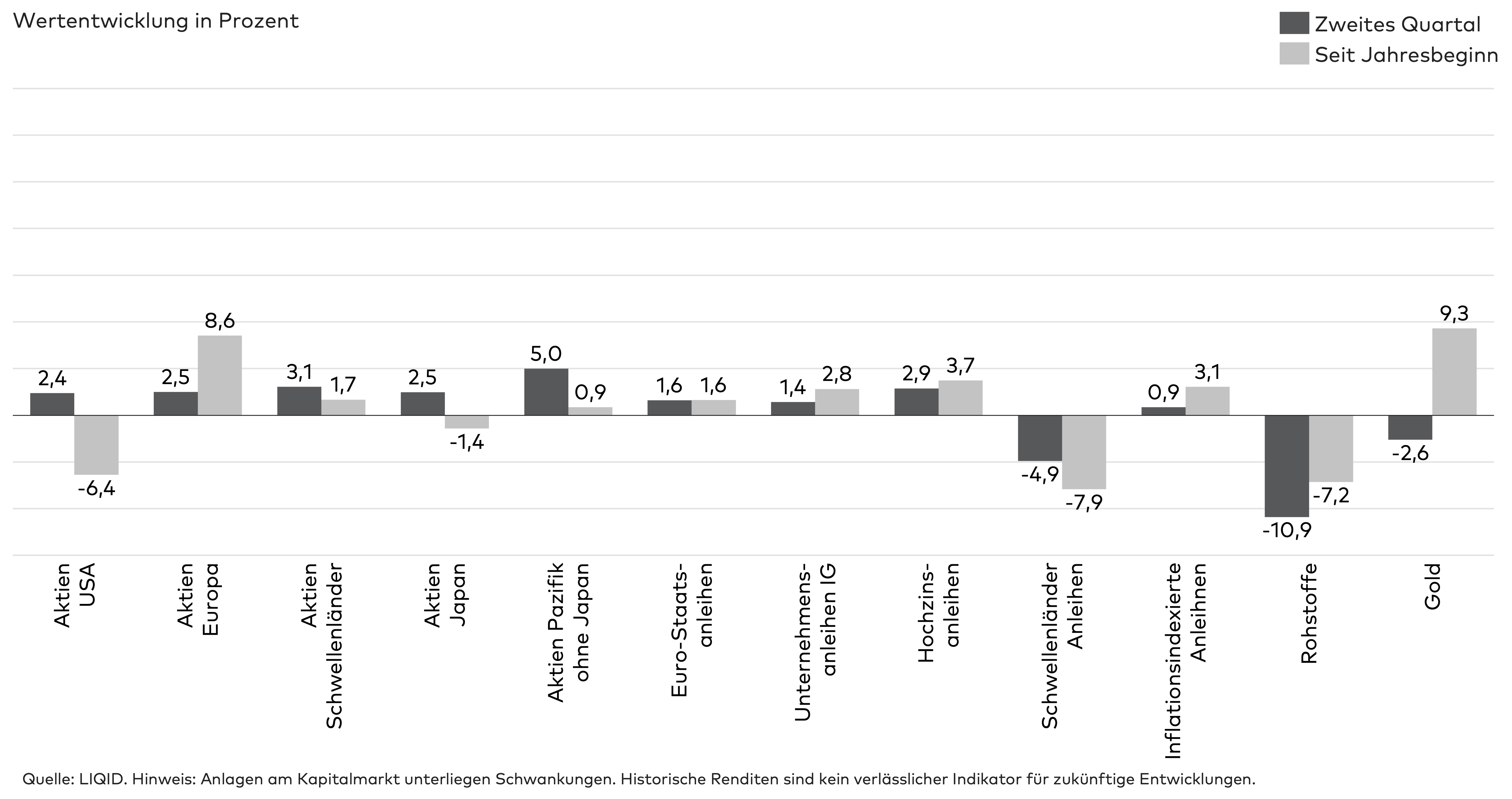 Im zweiten Quartal 2025 erzielten die Aktienmärkte weltweit trotz anhaltender Volatilität positive Renditen. Besonders stark entwickelten sich Aktien aus dem Pazifikraum (ohne Japan). Gold setzte seinen Aufwärtstrend aus den vergangenen Quartalen fort und bestätigte erneut seinen Ruf als „sicherer Hafen“. Rohstoffe hingegen verzeichneten teilweise spürbare Rückschläge.