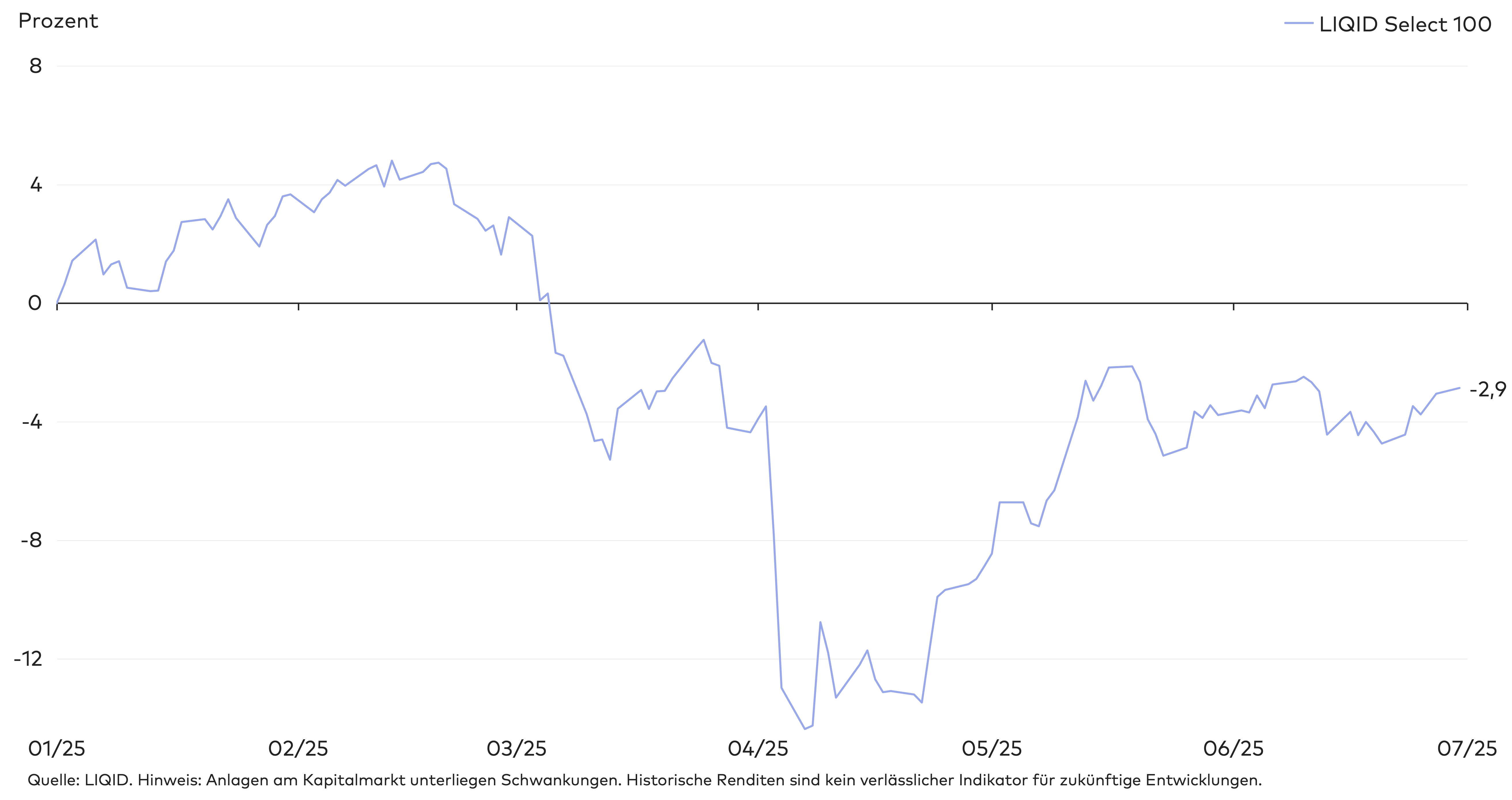 Im zweiten Quartal fielen die Ergebnisse der LIQID Select Strategien gemischt aus. Je nach Aktienanteil lag die kumulierte Wertentwicklung seit Jahresbeginn zwischen 1,5 und -2,9 Prozent. Besonders der sogenannte „Liberation Day“ Anfang April löste eine Welle der Verunsicherung aus und führte zu deutlichen Kursrückgängen an den Finanzmärkten. Zusätzlich führte die Aufwertung des Euro gegenüber dem US-Dollar und Yen zu einer verminderten Rendite.