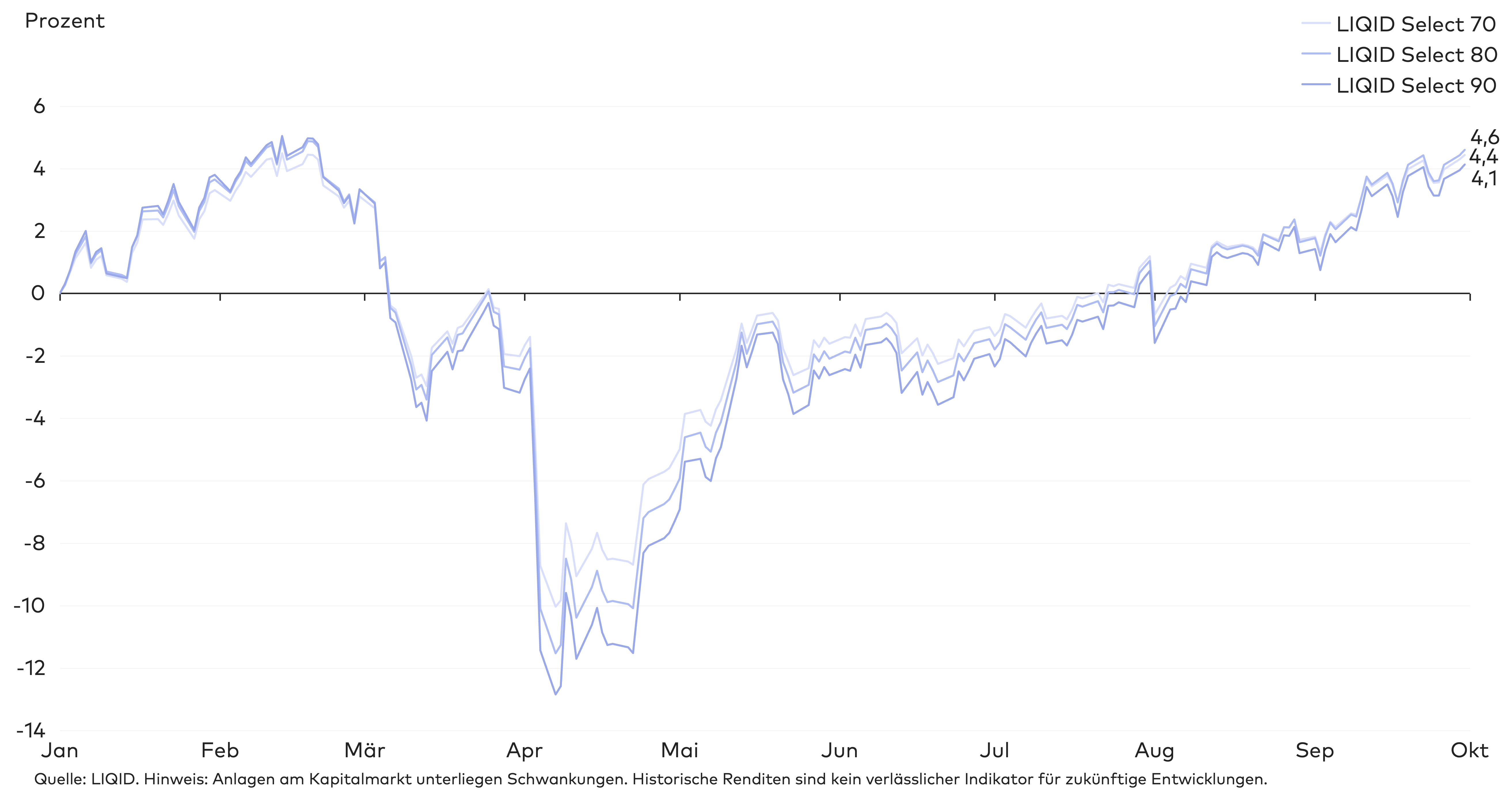 Im bisherigen Jahresverlauf haben die LIQID Select Strategien relativ zu ihren Benchmarks sehr gut abgeschnitten. In fast allen Risikoklassen lag die kumulierte Rendite der LIQID Strategien über den jeweiligen Vergleichswerten.