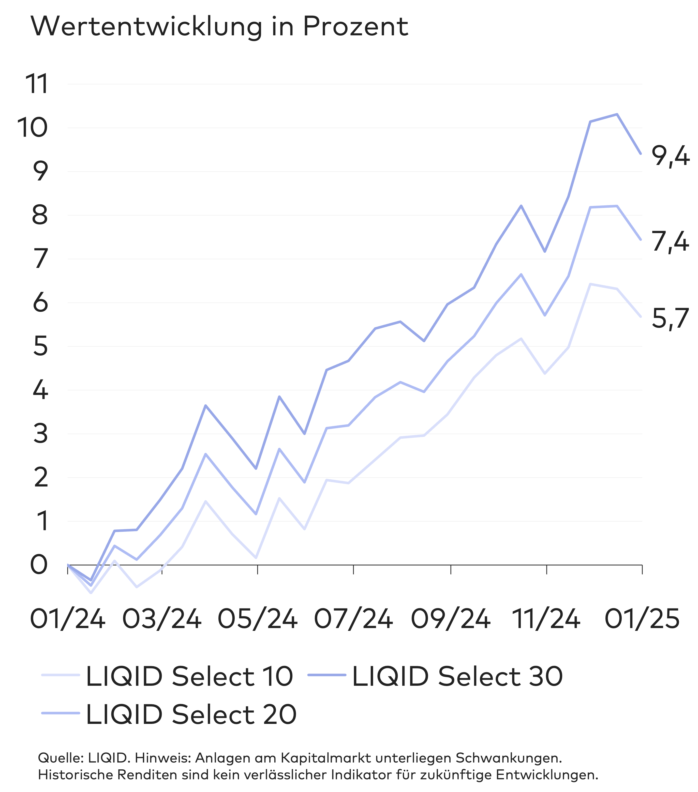 Im vierten Quartal erzielten alle LIQID Select Strategien positive Renditen. Der kumulierte Wertzuwachs lag je nach Aktienanteil der Strategie zwischen 0,8 und 4,9 Prozent. Nachdem im vorherigen Quartal Anleihen eine bessere Performance als Aktien gezeigt hatten, waren es in diesem Quartal erneut Aktien, die maßgeblich zur positiven Entwicklung beitrugen.