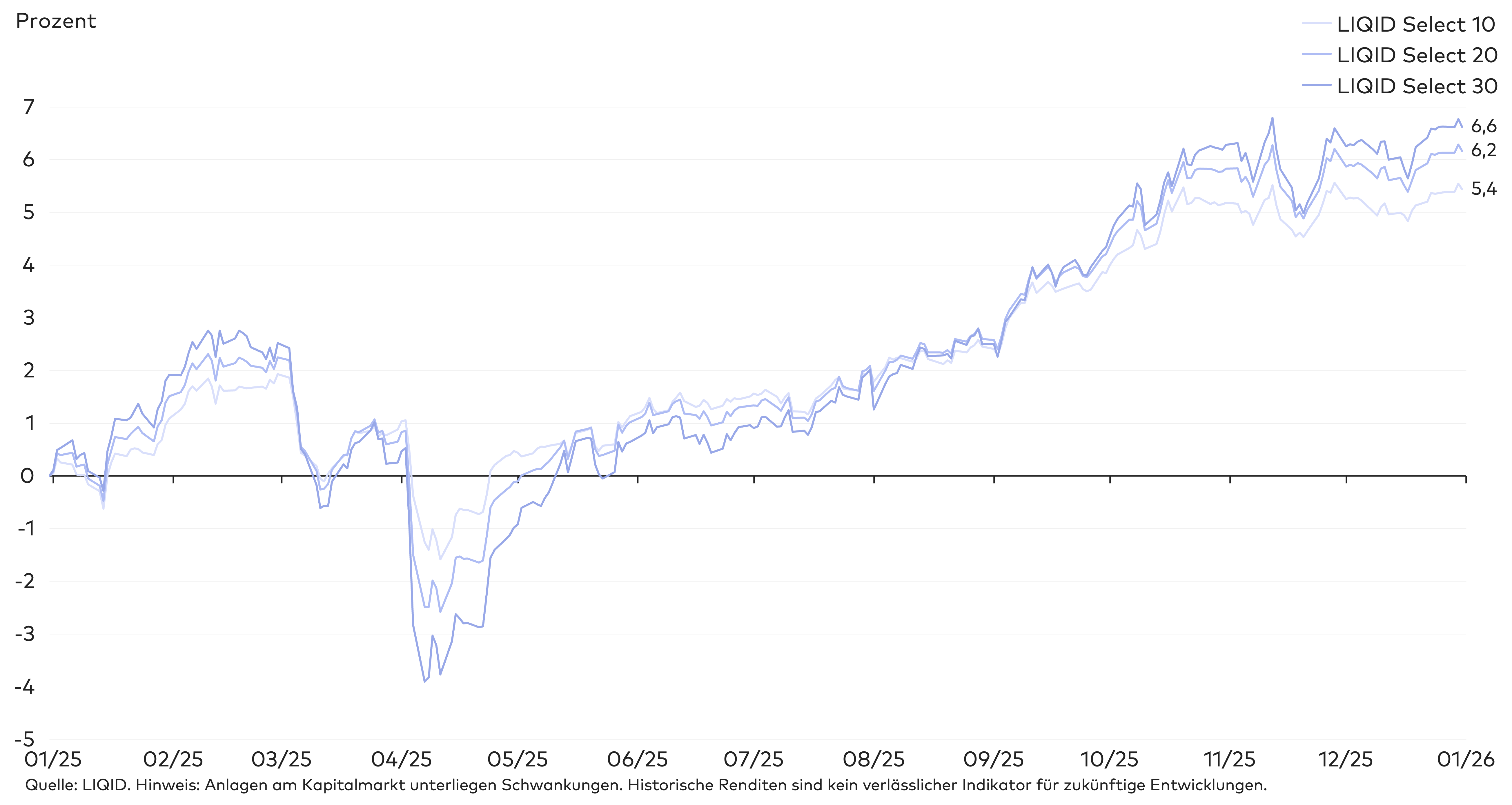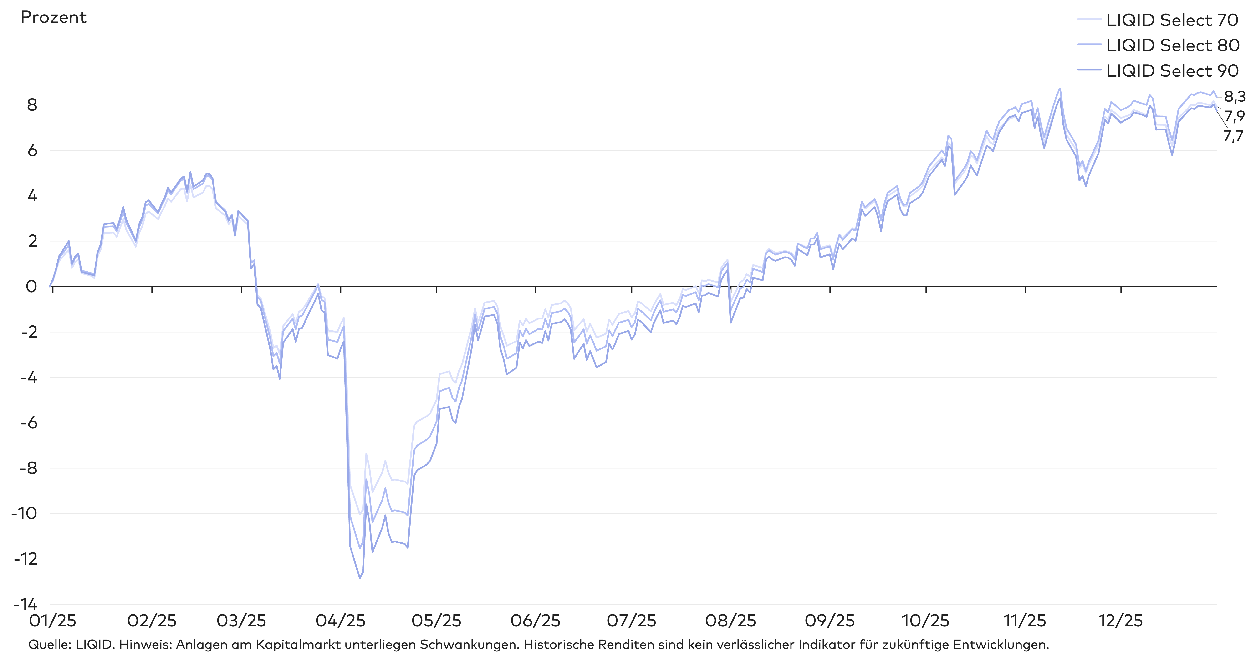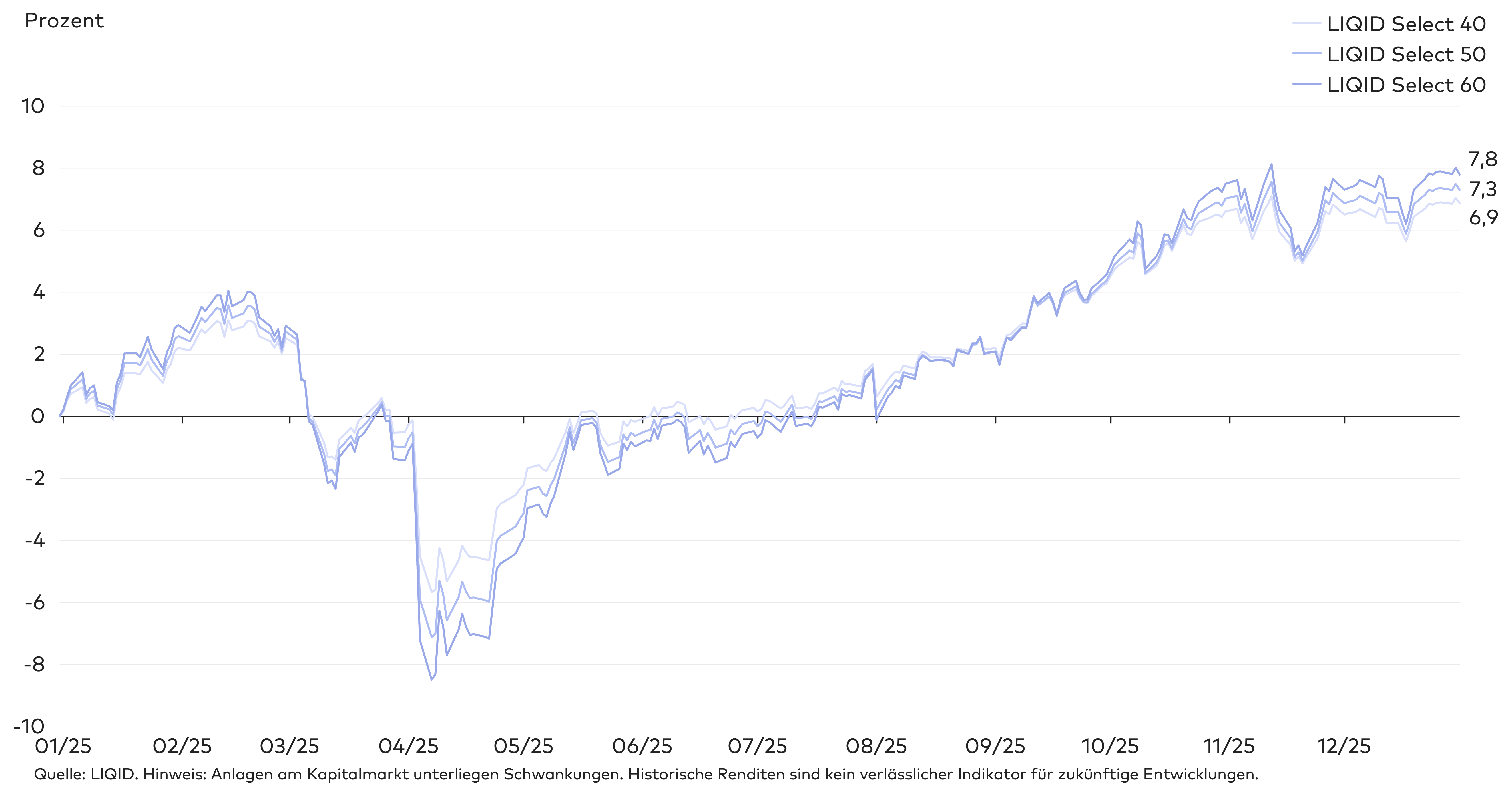 Damit haben die LIQID Select Strategien relativ zu ihren Benchmarks sehr gut abgeschnitten. In allen Risikoklassen außer 90 und 100 lag die kumulierte Rendite der LIQID Strategien über den jeweiligen Vergleichswerten.
