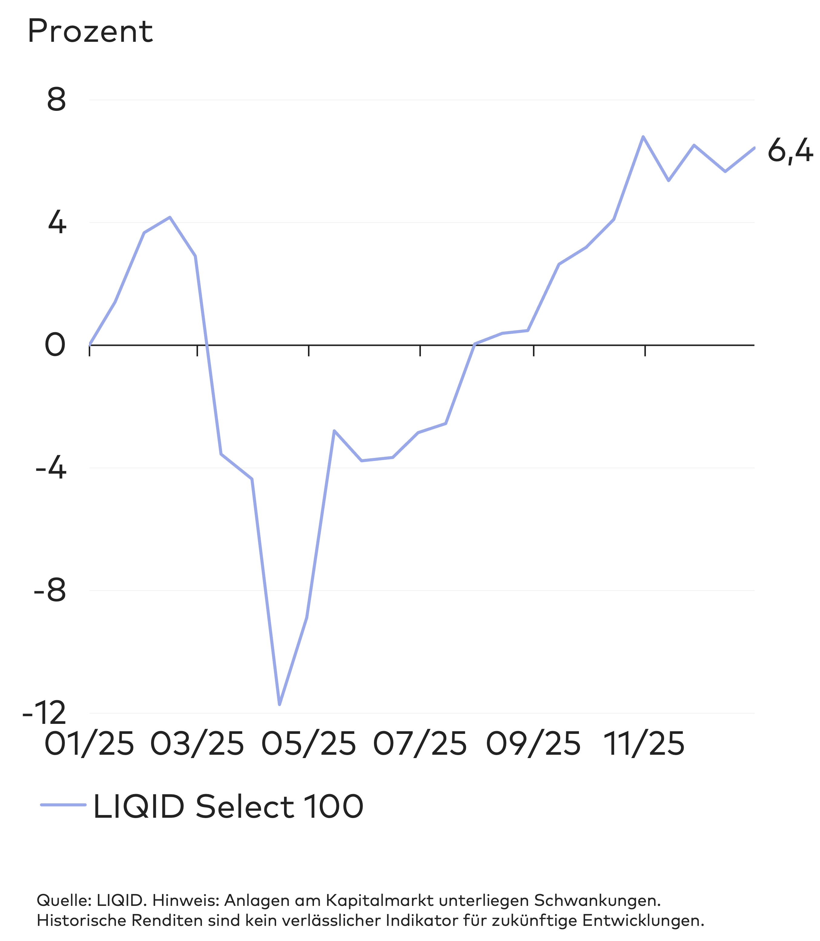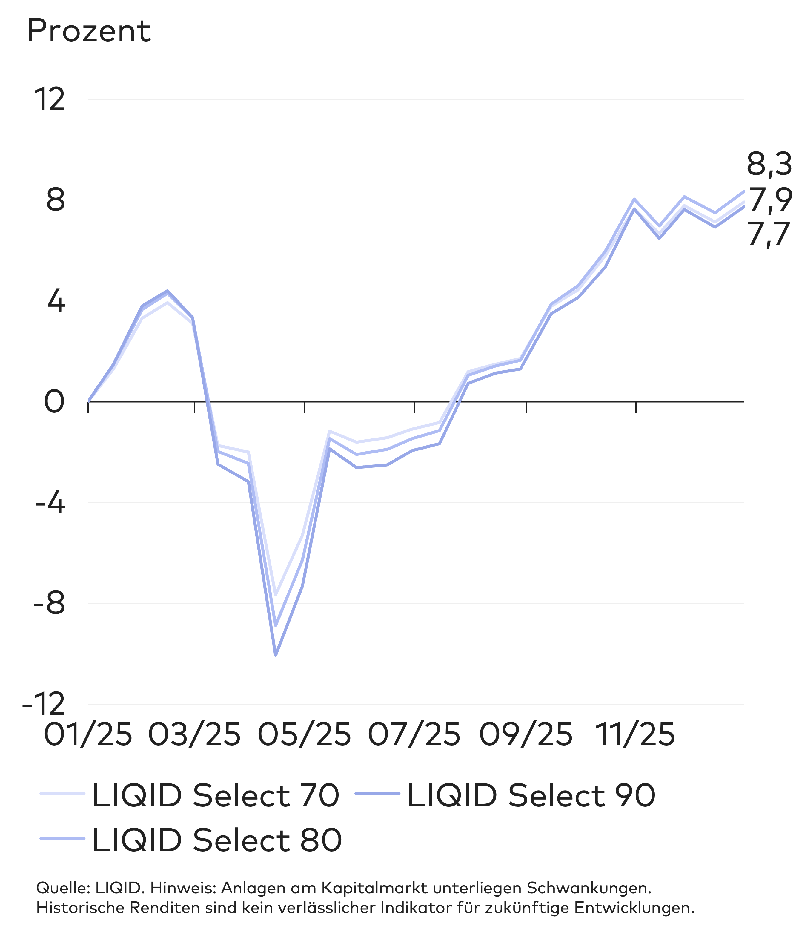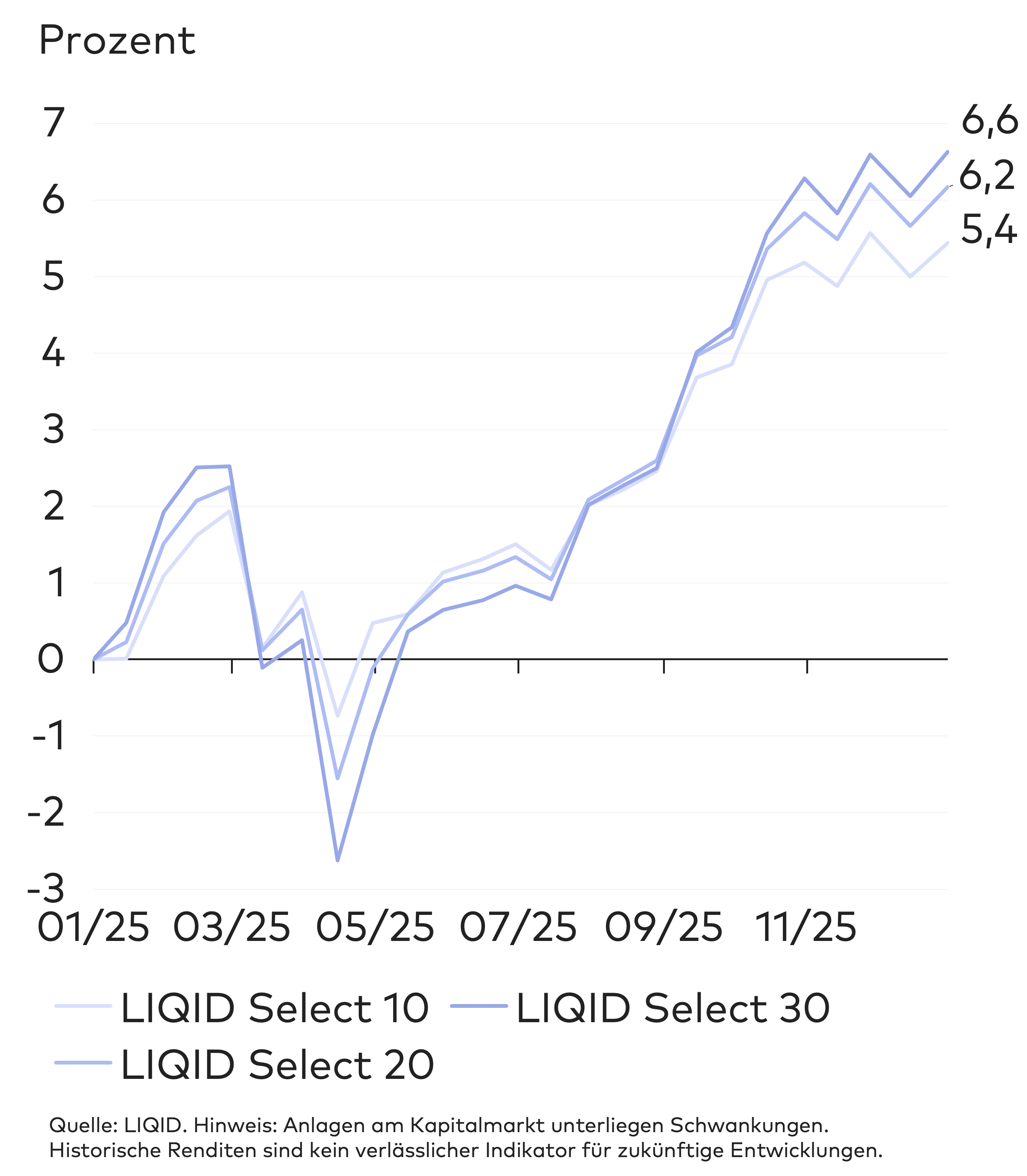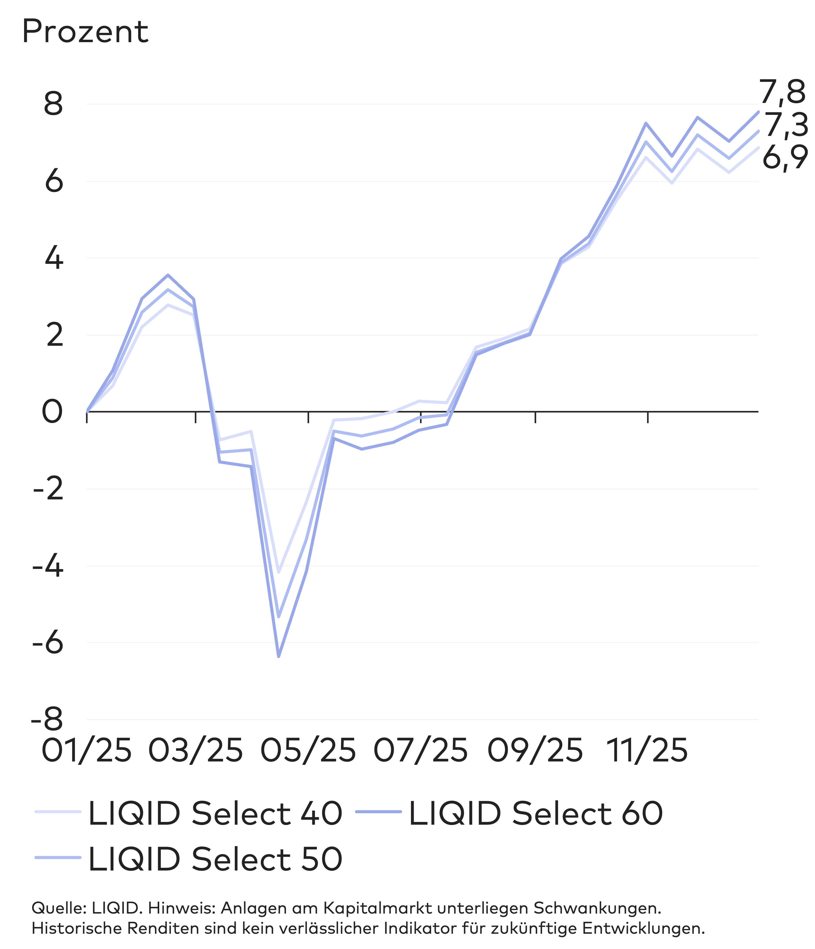 Damit haben die LIQID Select Strategien relativ zu ihren Benchmarks sehr gut abgeschnitten. In allen Risikoklassen außer 90 und 100 lag die kumulierte Rendite der LIQID Strategien über den jeweiligen Vergleichswerten.