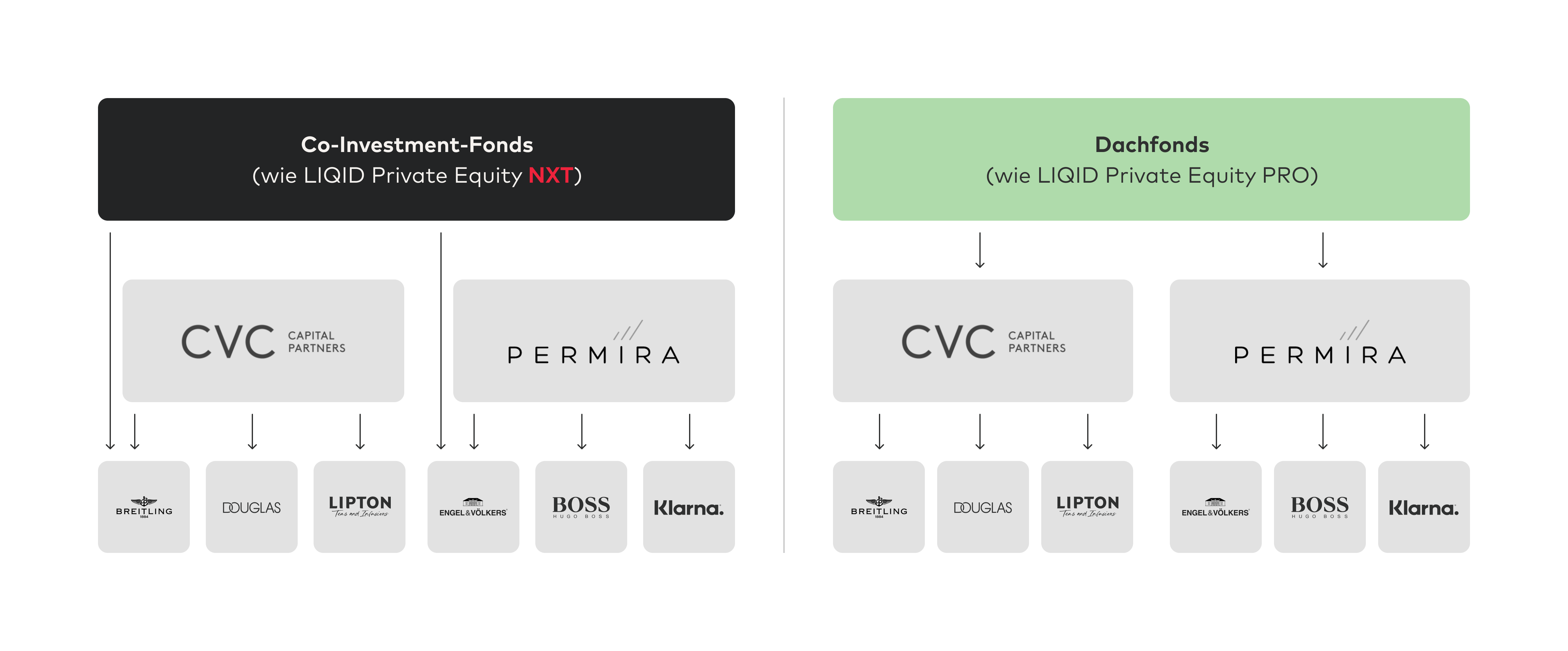 Während ein Co-Investment-Fonds also, wie im linken / oberen Beispiel, gemeinsam mit CVC in Breitling oder mit Permira in Engel & Völkers investiert, beteiligt sich ein klassischer Dachfonds, wie im rechten / unteren Beispiel, an den relevanten CVC- bzw. Permira-Fonds und ist über sie in Breitling bzw. Engel & Völkers investiert.