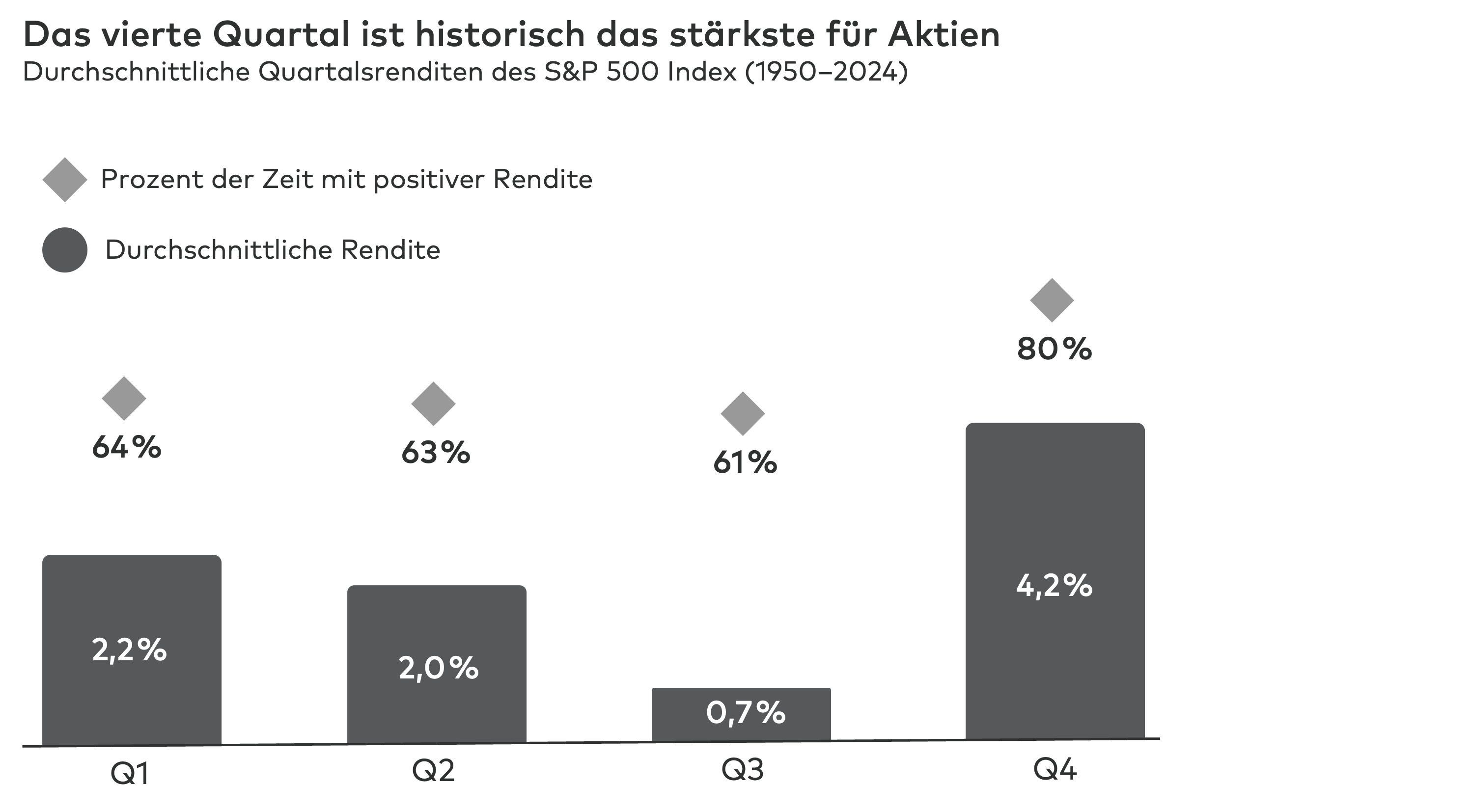 - Statistische Daten, etwa für den S&P 500, zeigen für Q4 in etwa 80 Prozent der Jahre positive Renditen. Eine Garantie für die Zukunft gibt es jedoch nicht.
