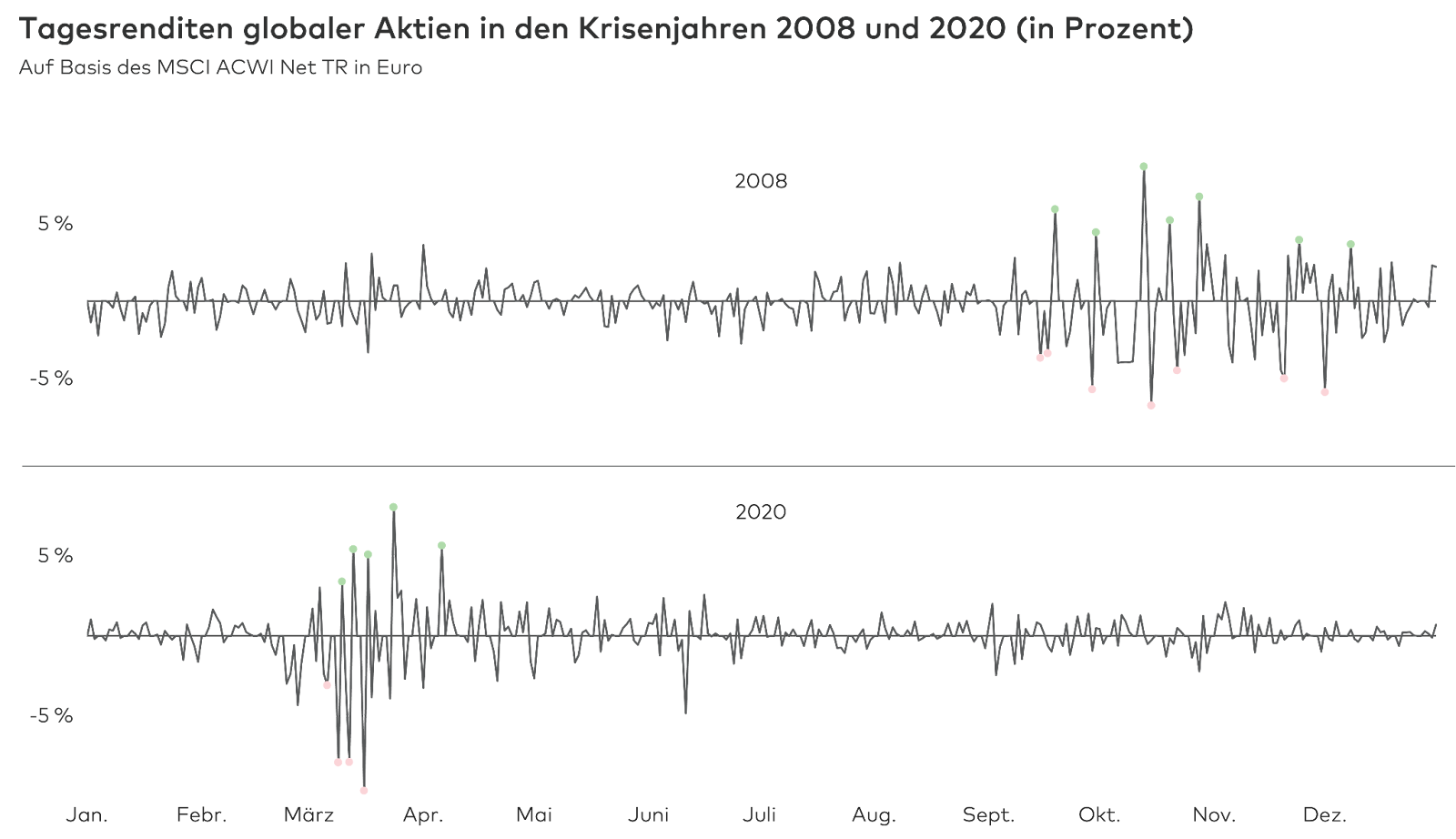 Wie eng diese Tage zusammenliegen können, zeigt diese Grafik exemplarisch für das Jahr 2008 (Weltfinanzkrise) und für 2020 (Corona-Pandemie-Schock). Aber auch in anderen historischen Krisenphasen war dieses Muster regelmäßig zu beobachten.