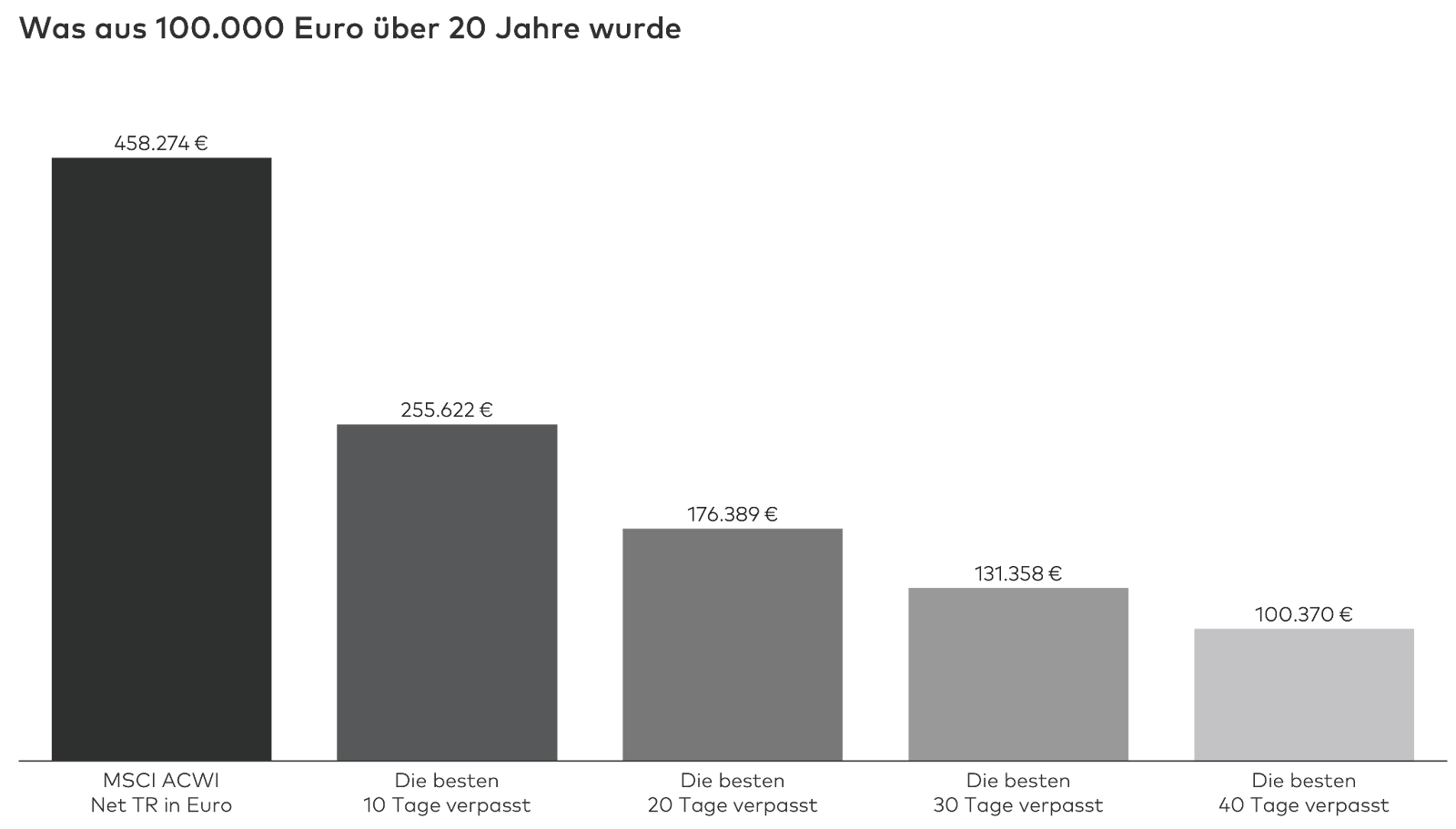Wie viel Rendite Anleger tatsächlich verpassen, wenn sie an den stärksten Börsentagen nicht investiert sind, zeigt die nachfolgende Grafik. Wer in den letzten 20 Jahren die zehn besten von insgesamt 5.220 Handelstagen im globalen Aktienindex MSCI ACWI verpasste, verlor fast die Hälfte der möglichen Rendite. Aus 100.000 € Anlagebetrag wären so statt fast einer halben Million nur rund 255.000 € geworden. Wurden die besten 40 Tage verpasst, blieb eine positive Wertentwicklung nahezu vollständig aus.